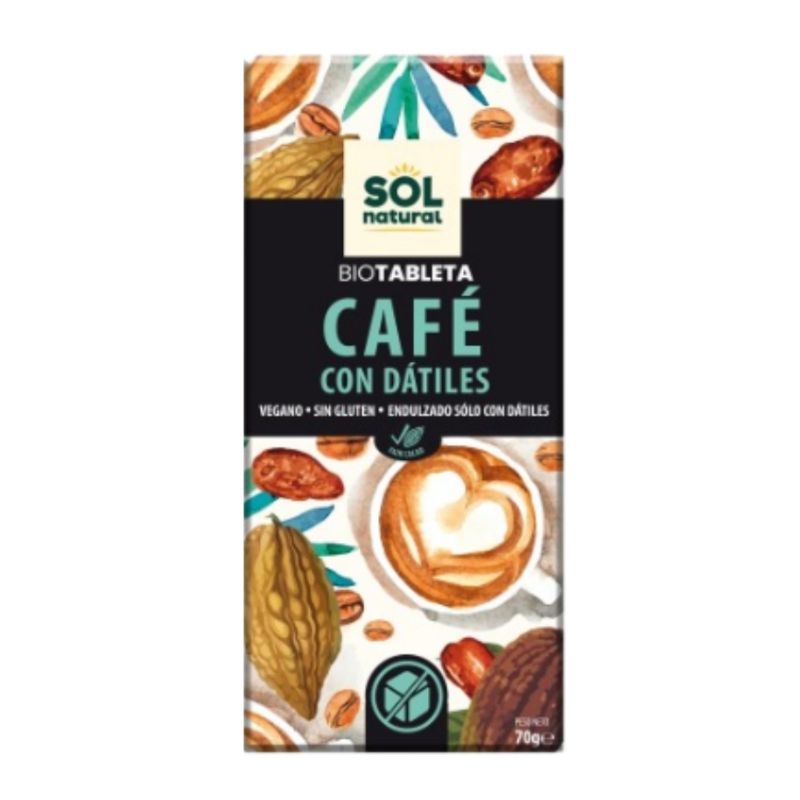 Chocolate Cafe Con Datiles de Solnatural es una tableta gourmet que une el intenso aroma del café ecológico con la dulzura natural del dátil para crear un chocolate equilibrado, aromático y lleno de matices. Elaborado con ingredientes procedentes de agricultura ecológica, este chocolate destaca por su sabor profundo, sus notas tostadas y su dulzor suave sin azúcares refinados.