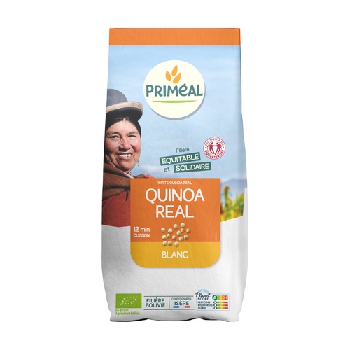 La quinoa blanca real de Primeal es una semilla de la familia Chenopodiaceae (como la espinaca) asimilada a un cereal debido a su composición nutricional. La quinua es una fuente de proteínas muy equilibrada, fuente de fibra y magnesio.