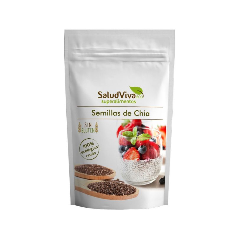 Semillas de Chía de Salud viva, aportan múltiples beneficios nutricionales esenciales para una dieta equilibrada. Ricas en fibra entre un 50% y 60% y al no tener gluten pueden perfectamente consumirlo los celiacos. También rico en ácidos grasos (Omega 3 y 6), proteínas (cerca de un 20%), vitaminas (del grupo B y E) y minerales (Calcio, Hierro, Magnesio, Potasio, Zinc, Manganeso, Fósforo y Cobre), elementos fundamentales para el buen funcionamiento del organismo.